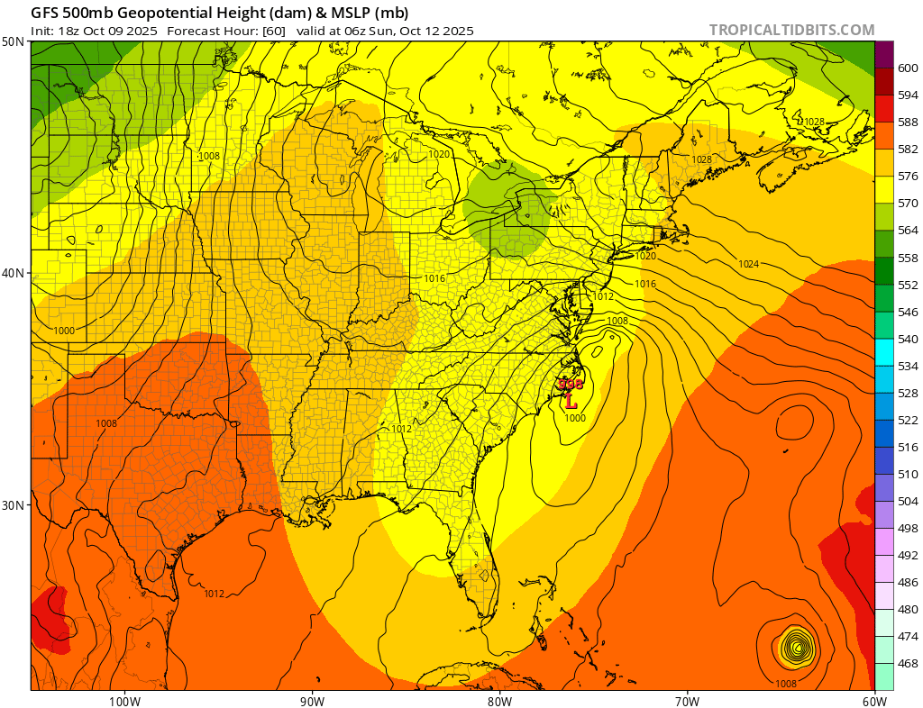 Image: Forecast 500mb geopotential height and mean sea level pressure, showing an upper-air trough over the Southeast U.S. and a surface-based low pressure system near the North Carolina coast early on Sunday morning. Source: TropicalTidbits.com