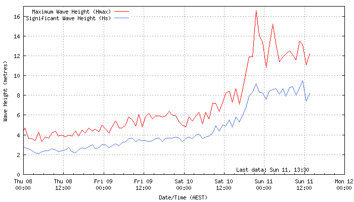 Swell observations, including Significant Wave Height, Maximum Wave Height, Peak Wave Period, Average Wave Period and Wave Direction, recorded at the Cape Sorell Directional Wave Buoy located about 10km offshore, west of Cape Sorell, western Tasmania. (bom.gov.au)