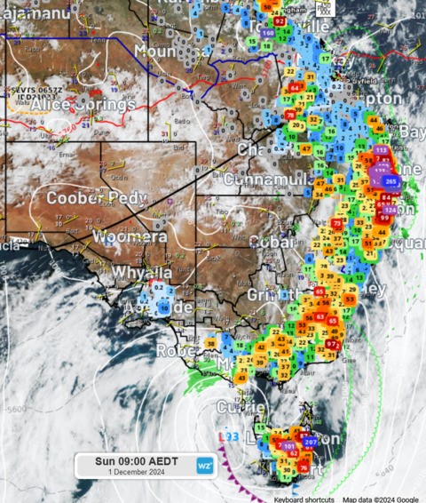 Image: Rainfall in millimetres from 9am Saturday to 9am AEDT Sunday with a background of satellite, radar and the synoptic pattern.