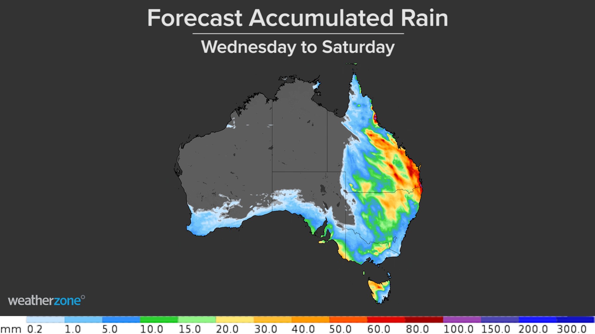 Altogether, widespread falls of 10-20mm are likely over a broad area of Queensland and NSW between now and Sunday. Some areas of central and southeast Queensland and far northeast NSW could see 50-100mm from this system.