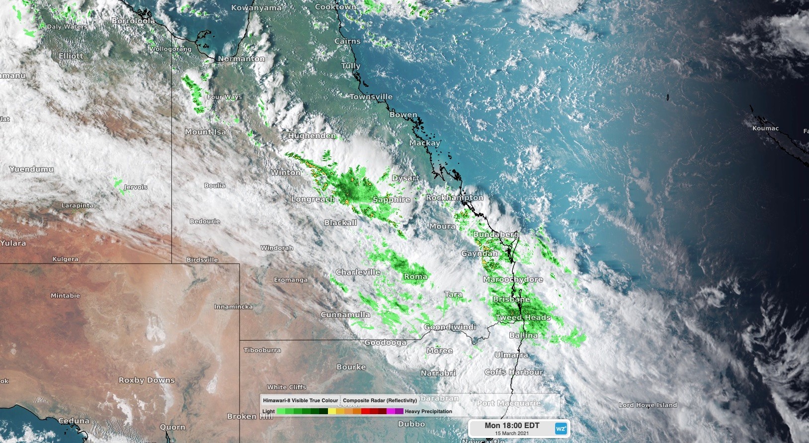 Image: Combined satellite and radar image showing cloud and rain over Queensland on Monday afternoon.