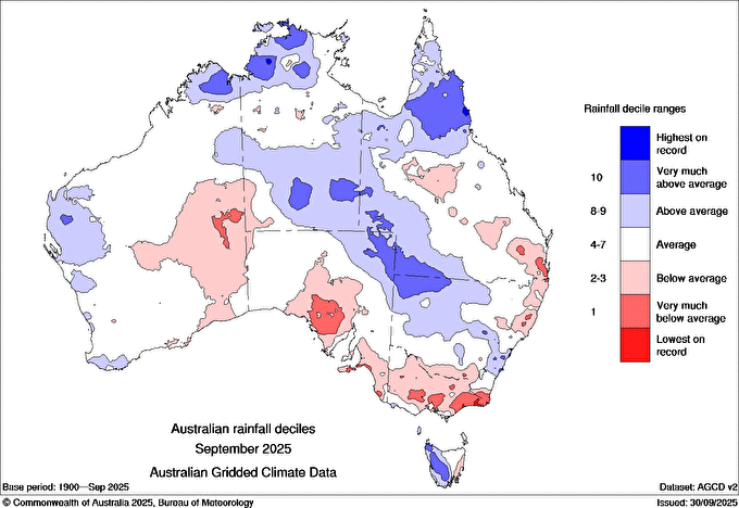 Image: Rainfall deciles during September 2025. The red areas show where rainfall was below average, and the blue areas show where rain was above average. Source: Bureau of Meteorology.