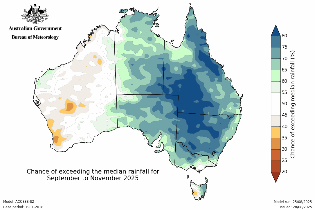 Image: Spring rainfall outlook issued by the Bureau of Meteorology at the end of August 2025. Source: Bureau of Meteorology