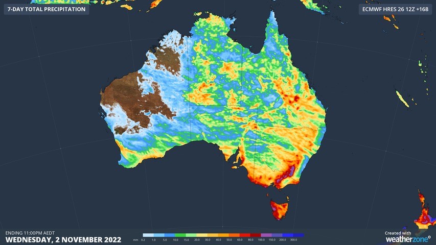 Images: Forecast accumulated rain during the seven days ending at 11pm AEDT on Wednesday, November 2 (top two maps) and 5am AEDT on Thursday, November 3 (bottom map).