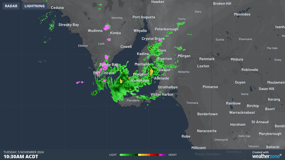 Image: Rain radar near Adelaide at 12:30pm (ACDT) on Tuesday, November 5.
