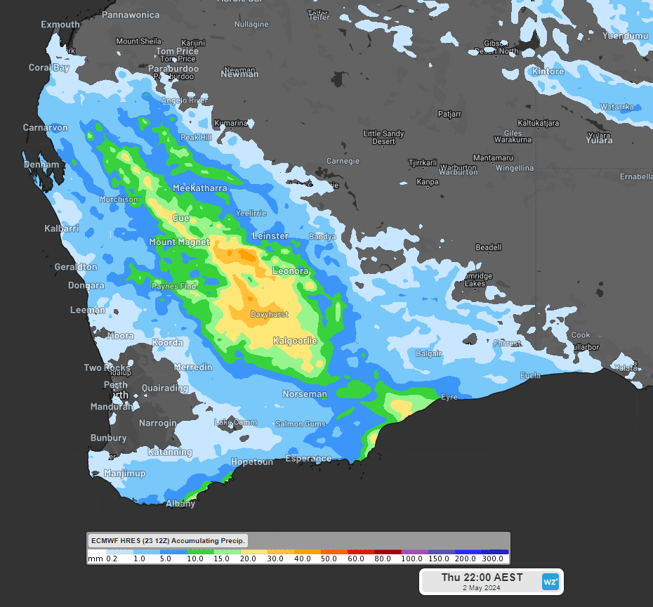 Rain will intensify early to mid-next week, with the largest totals expected on Tuesday, April 30 across western and southern WA, possibly hitting parched Perth.