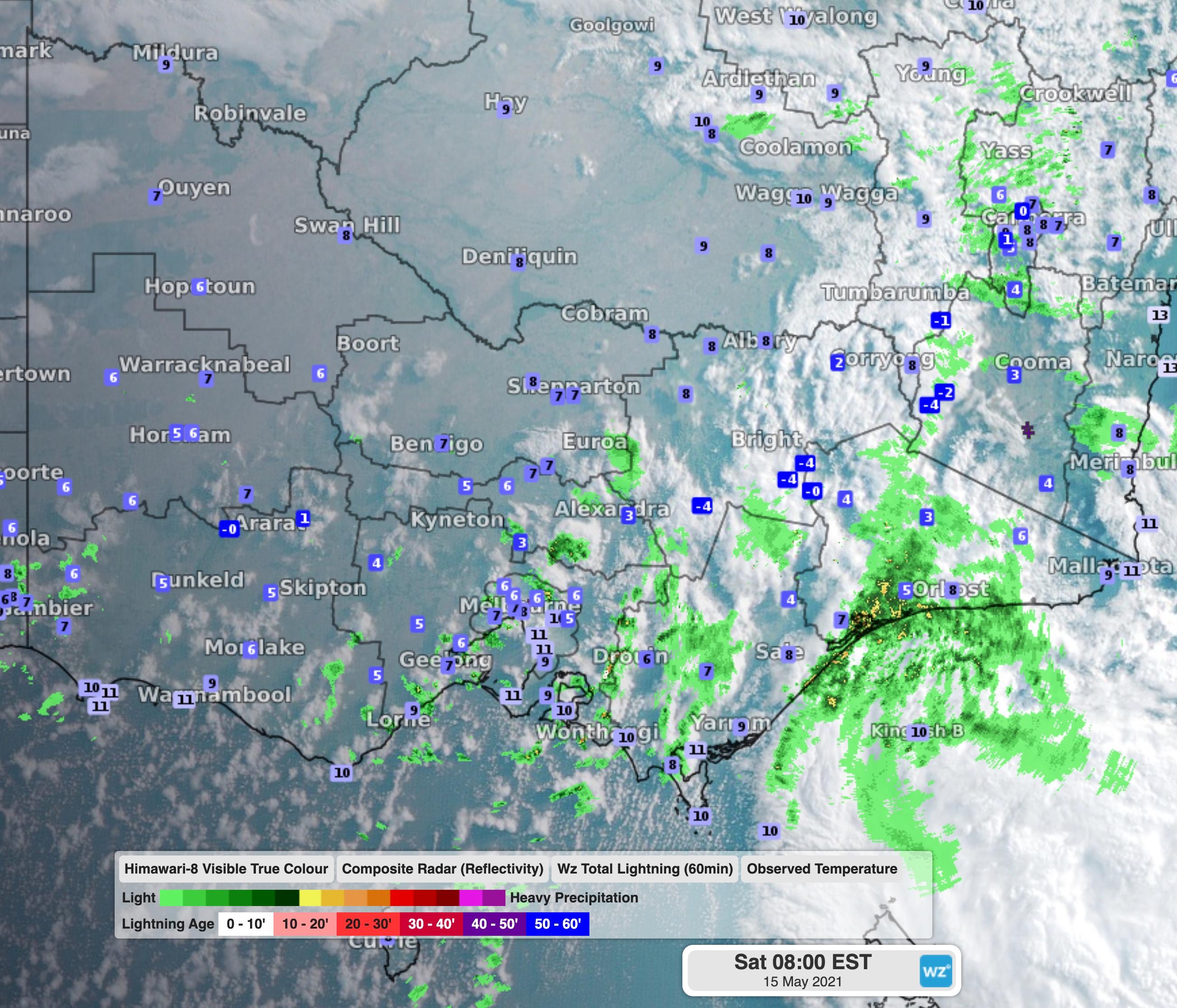 Image: Satellite, radar, observed temperatures and lightning over Victoria on Saturday morning, showing the cold front pushing over the state.