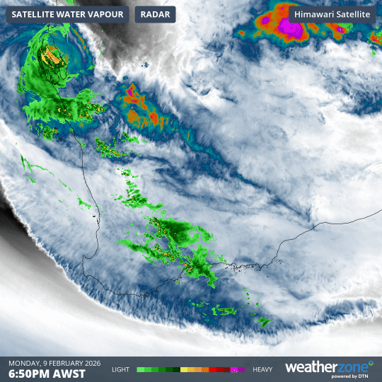 Image: 12-hour loop showing atmospheric water vapour and rainfall activity over southwest WA from 7pm (AWST) on Monday, February 9, 2026, to 7am on Tuesday, February 10.