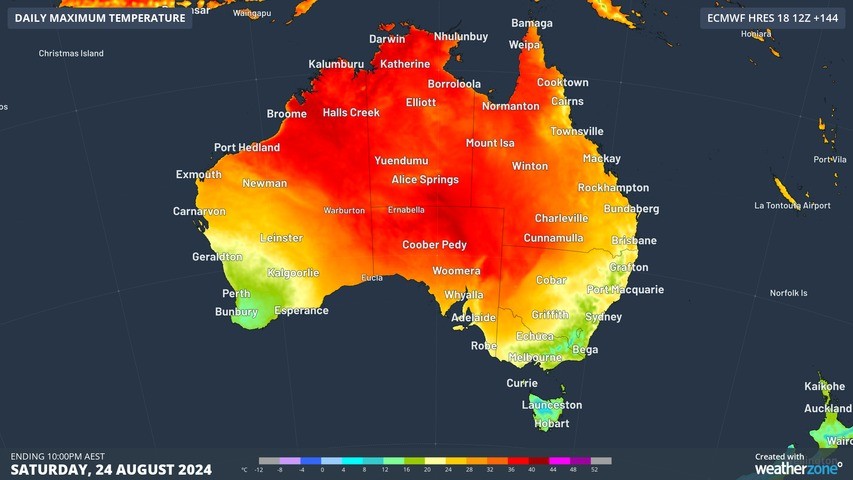 A strong, near-stationary high pressure system centred over the heart of the continent this week is the engine that will enable heat to build up in the interior of the country under clear skies. You can see Saturday's expected maximums illustrated in the chart below.