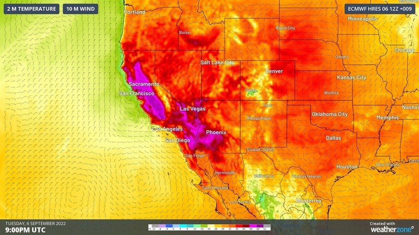 Death Valley’s Furnace Creek weather station hit 125.2ºF (51.8ºC) shortly before 5pm local time on Tuesday. This was only 0.4ºC below the maximum temperature world record for September, which is 126ºF (52.2ºC) from Mecca (USA) in 1950.