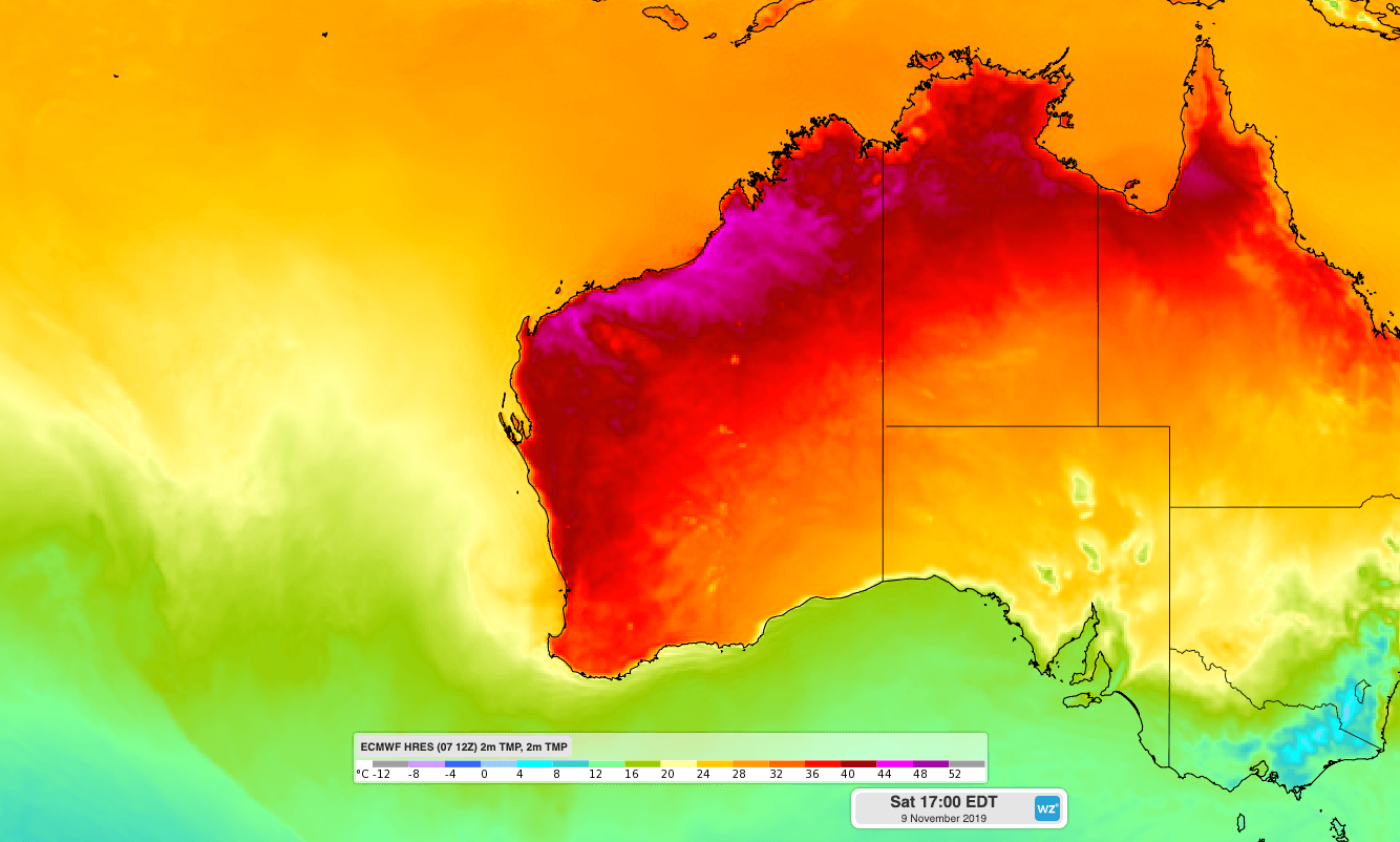 Perth is forecast to reach 35 degrees today and 40 degrees on Saturday, with a minimum of 23 degrees in between. This would be the city's warmest November night in nine years and their warmest day (Saturday) in 16 years.