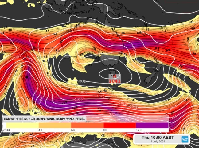 A ‘blocking-high’ occurs when the jetstream splits around a high pressure centre, locking it in place for days or even weeks at a time. A clear jetsream split can be seen over Australia this week.