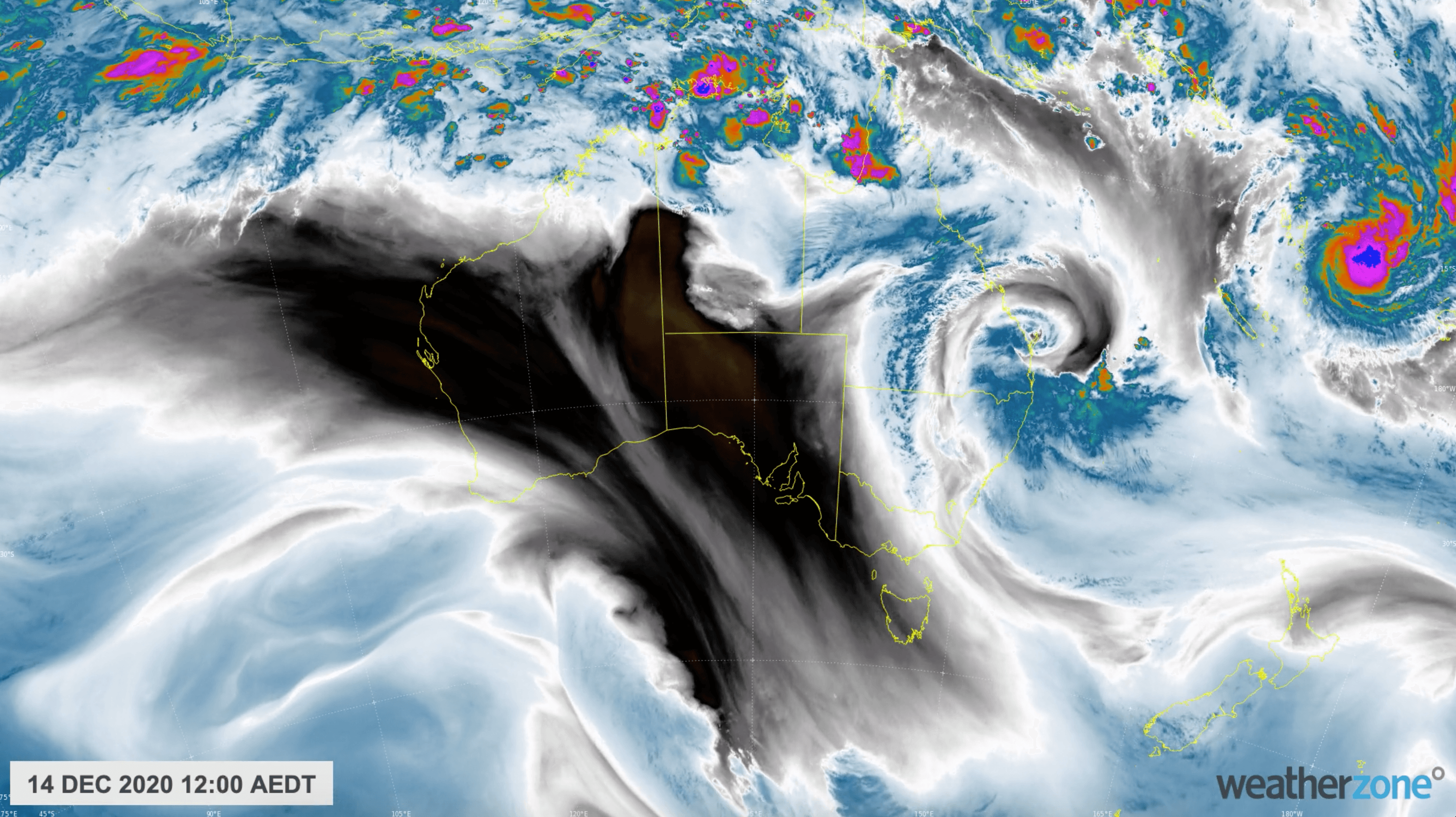 Image: Enhanced water vapour satellite image showing abundant tropical moisture wrapping around an upper-level low pressure system near southeast Queensland.