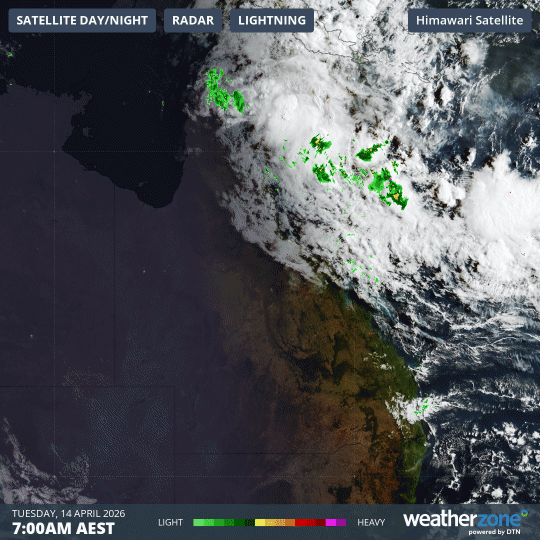 Image: Combined radar and satellite loop over Queensland for the four hours to 11am (AEST) on Tuesday, April 14, 2026.