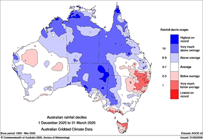 Image: Australian rainfall deciles from January to March, 2026. Source: BoM.