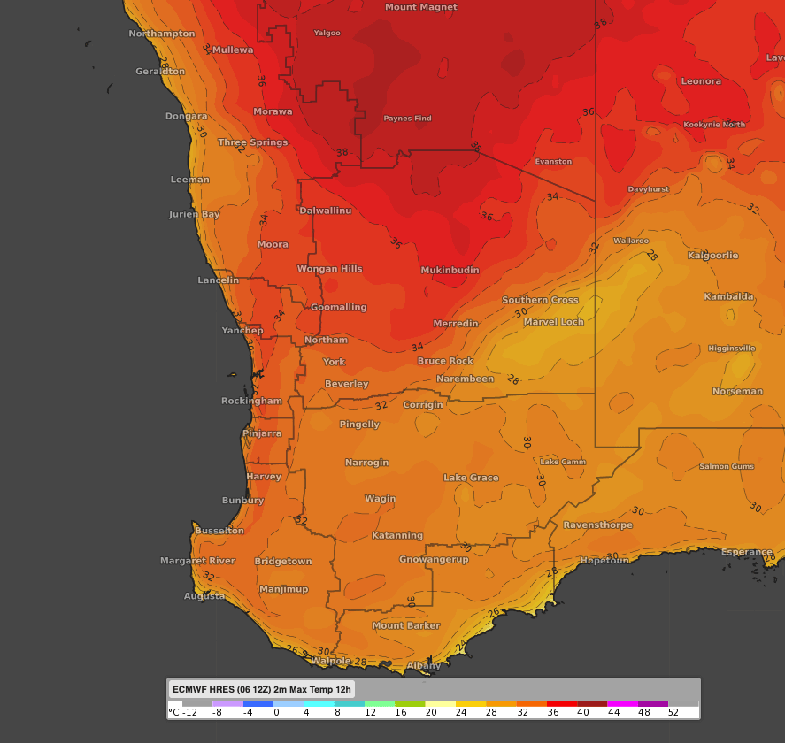 A broad area of high pressure will sit off the southern coast of WA during the next couple of days, moving over the Bight on Wednesday. As winds travel anticlockwise around a high pressure system, easterly winds will dominate in southern WA turning northeast as the high moves gradually east. As a consequence, a hot airmass will be drawn down from the western interior. On top of that, a trough will form near the west coast, which will help an offshore circulation preventing sea breezes.