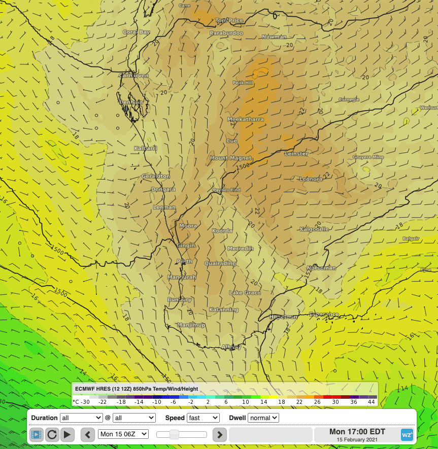 ECMWF Fri 12Z 850hPa Temperature showing heat developing over Perth