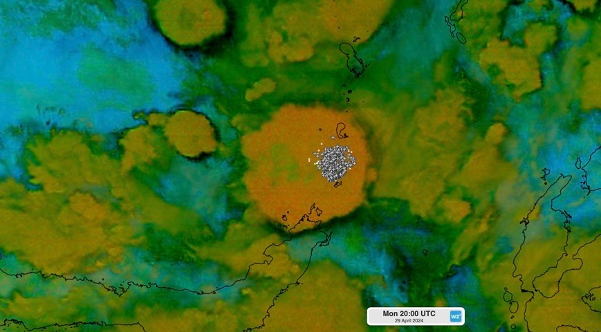 Video: Enhanced ‘ash’ satellite imagery and lightning observations showing the movement of the lightning-active Ruang Volcano plume on Tuesday, April 30, 2024.