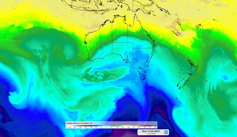 The animation below shows modelled air temperature around 1.5 km above the ground, with repetitive bursts of polar air being driven over southern, central and southeastern Australia this week.