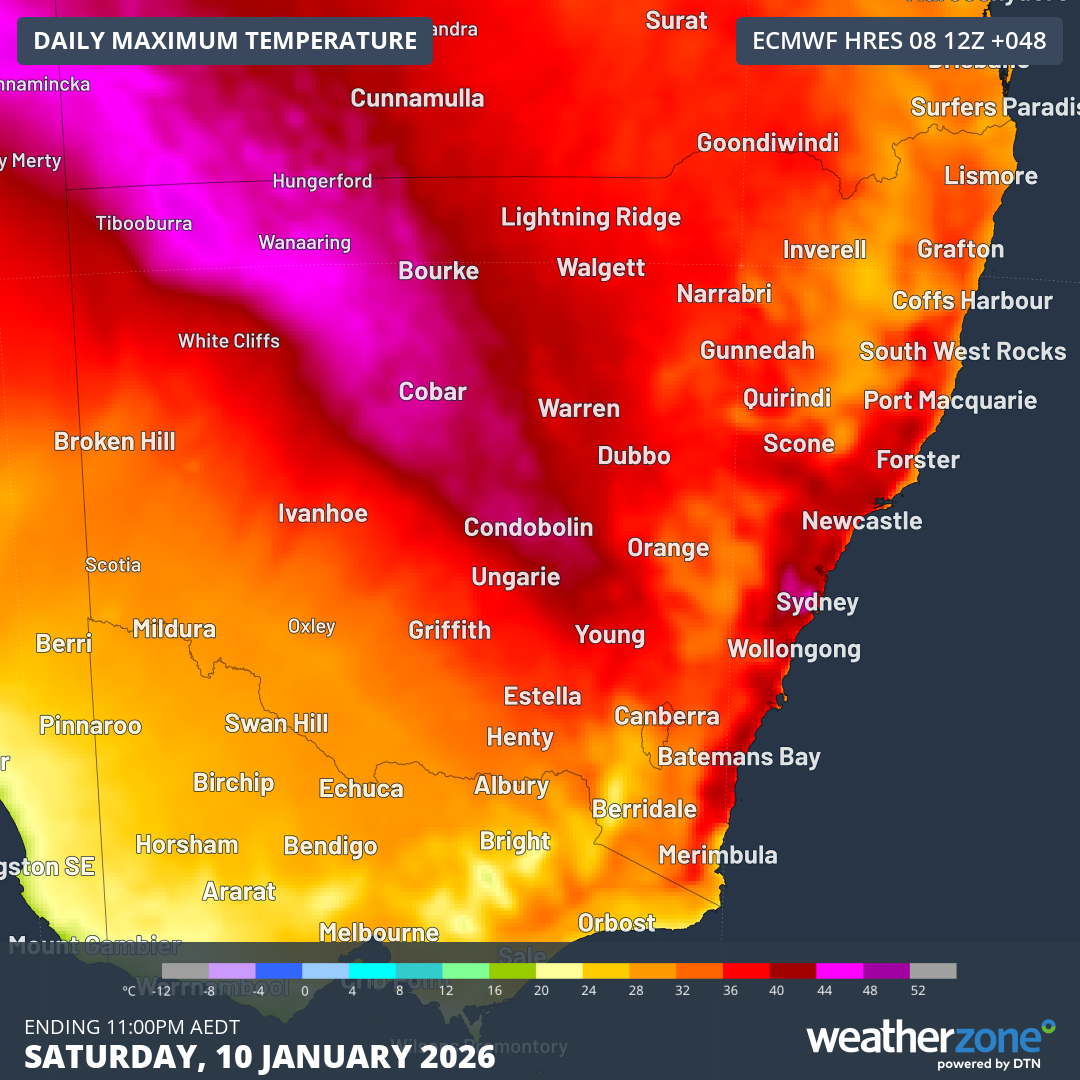 Image: Forecast maximums across NSW and Vic on Saturday, January 10, 2026, according to the ECMWF model. Note the small area of pink centred on Sydney.