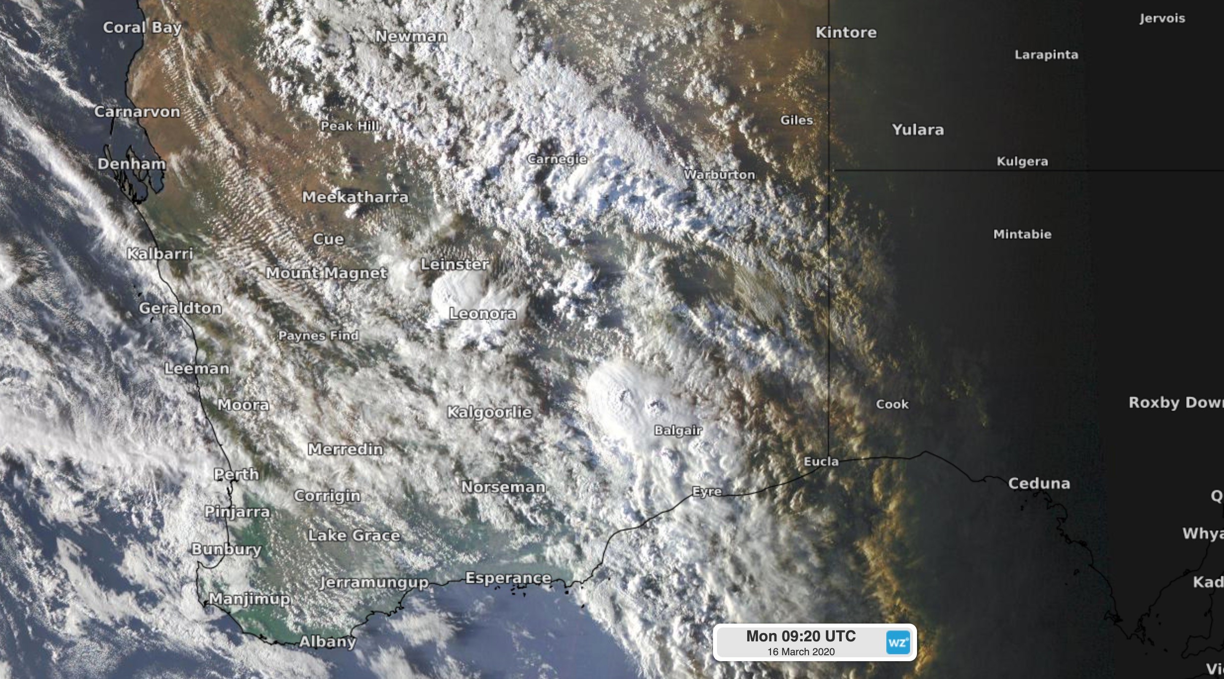Image: Satellite image showing thunderstorm cells over Western Australia's Goldfields and Eucla districts on Monday evening.
