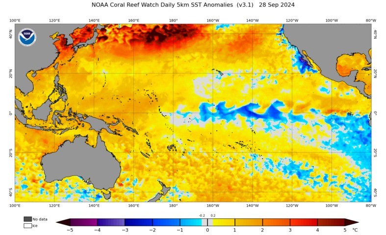 Image: Sea Surface Temperature anomalies from NOAA Coral Reef Watch over the last 30 days, showing a cool tongue of water moving into the central Pacific, a sign that a La Niña is becoming more likely to develop this year.