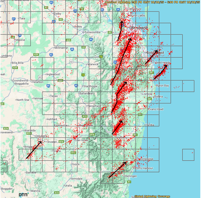 Image: Lightning strikes (red dots) captured by DTN's Global Lightning Network between 2pm and 5pm EDST. Black arrows show the path of stronger individual thunderstorm cells.