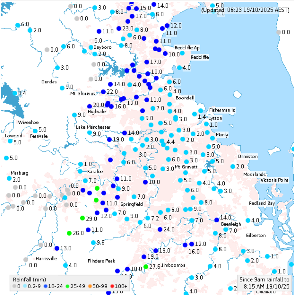 Image: 24-hour rainfall totals to 8:15am 19 October 2025. Source: Bureau of Meteorology