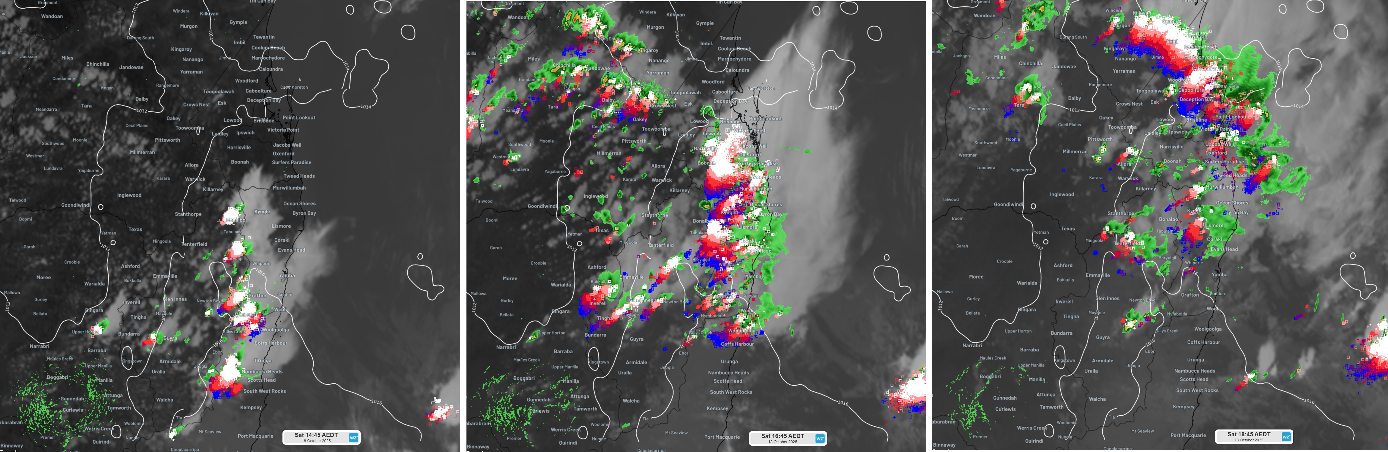 Thunderstorms developed on a southerly change and trough moving north across northeast NSW and into southeast Qld during Saturday afternoon and early evening.