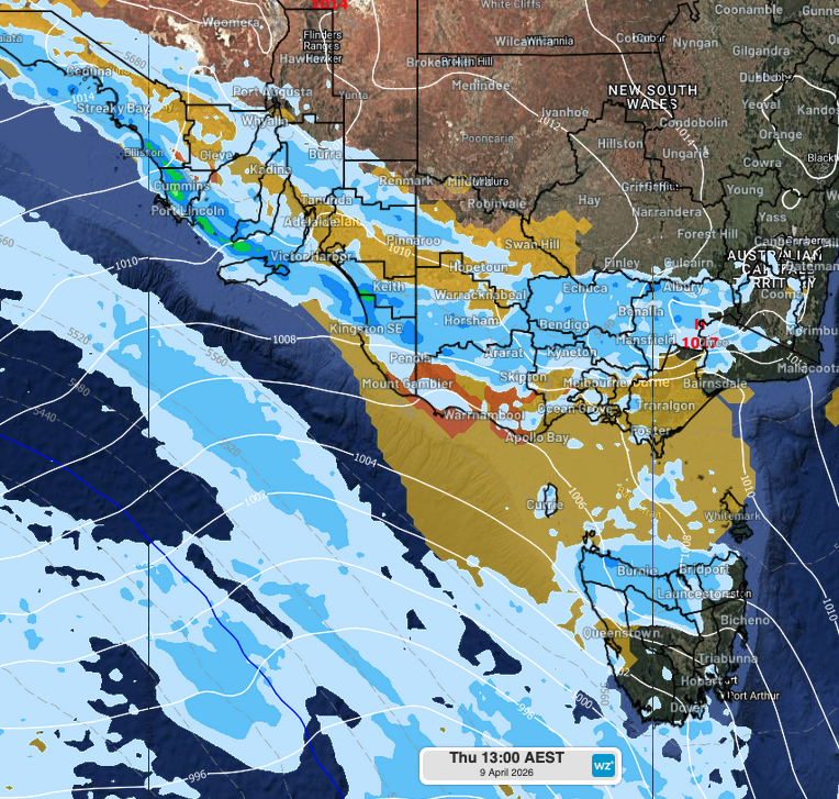 As colder air deepens across the region, snow may fall as low as around 600 metres in parts of Tas, while the odd flurry may extend into the Victorian ranges above 1000 metres if the cold air pushes far enough north. Cold air thunderstorms with small hail are also possible, marking a notable early-season wintry outbreak for April across southeast Australia.