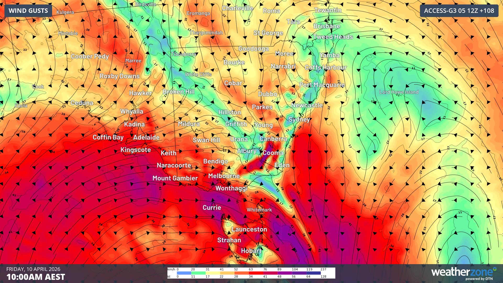 Image: Access-G 10m wind gusts for 10am EST Friday 10th April 2026.