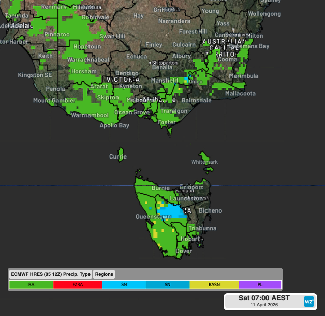 Image: ECMWF precipitation type for 7am EST Saturday 11th April 2026.
