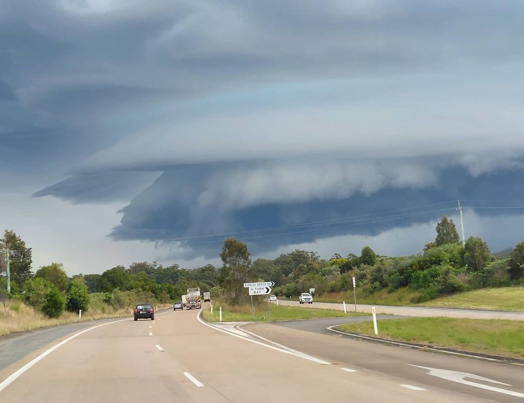 Image: A shelf cloud precedes a thunderstorm over Coopernook, NSW on Tuesday. Source: @nardoodigram