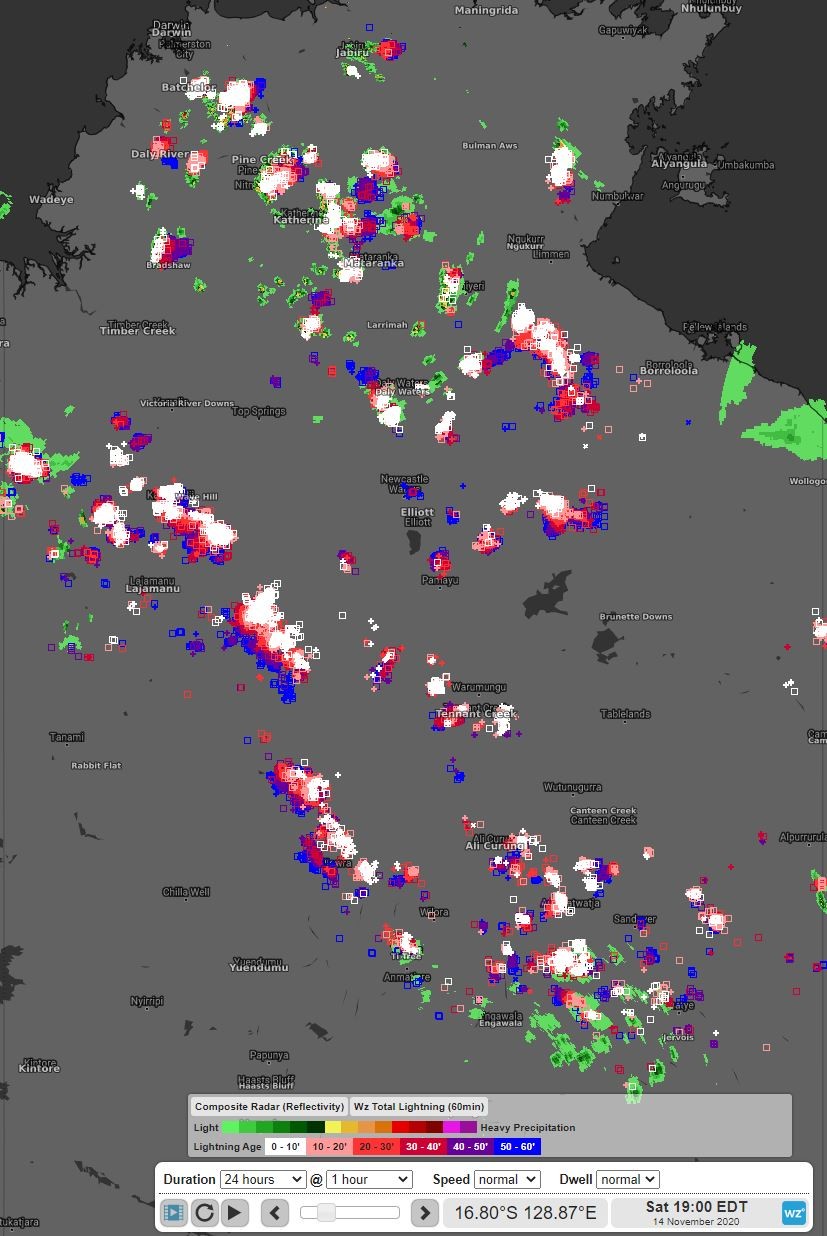 Storms sparked to life during Saturday afternoon, with some lingering through to Sunday morning. Rainfall was exceptionally heavy with some of the storms and a Severe Thunderstorm Warning was issued for some northern parts of the territory. Wandie Creek recorded the most rain with 107mm in the 24 hours to 9am on Sunday. Some other impressive 24 hour totals include 73mm at Douglas River, 71mm at Upper Ferguson River and 53mm at Old Delamere.