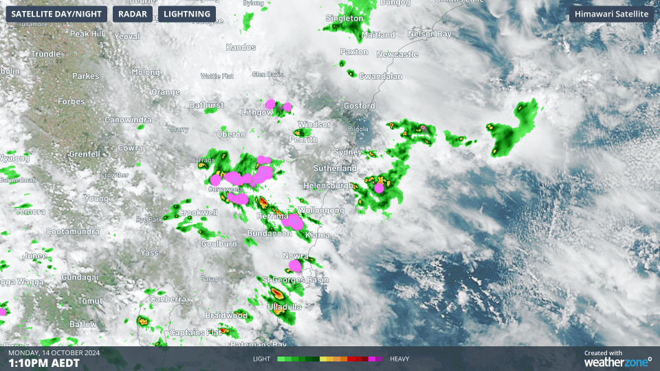 The radar loop above also shows that further storms lie to the west and southwest of the Sydney region, with storms also starting to build up around Canberra.