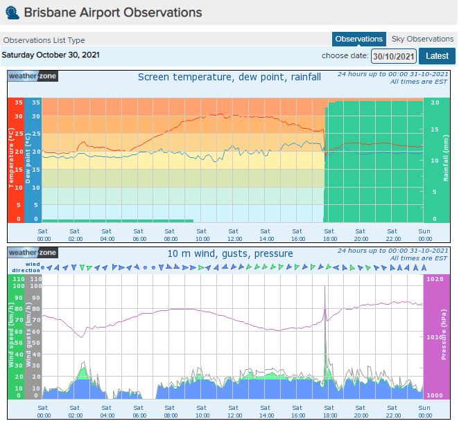 One of the more severe storms passed over Brisbane Airport during the early evening. As the storm roared overhead it brought wind gusts of up to 100km/hr and nearly 20mm of rain. Although this rainfall total isn’t particularly high, 17.6mm of it fell in the space of just 10 minutes. The storm also drew much colder air from the upper atmosphere down to the surface, dropping the temperature more than six degrees in five minutes.