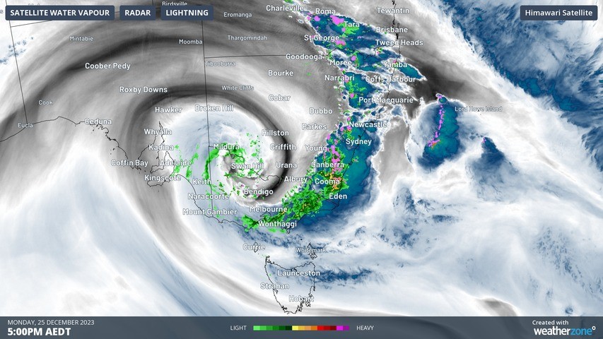 Animation: Himawari-9 water vapour imagery, BOM radar, and Weatherzone lightning from 2pm to 5pm on Monday 25 December