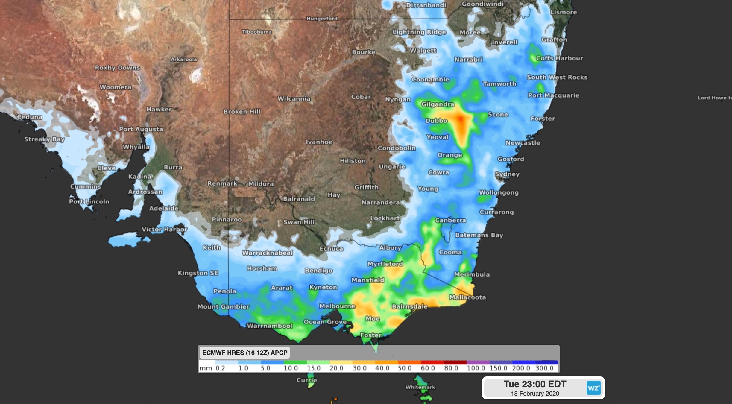 Image: Accumulated rainfall predicted on Tuesday, according to the ECMWF-HRES model. Totals are likely to be higher than this with some thunderstorms.
