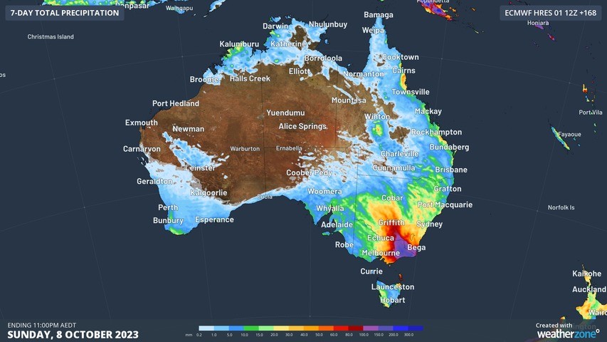 Image: The initial rainband could produce falls of over 100mm in NE Vic and southern NSW (24 hour rainfall to 1100AEDT from the ECMWF model)