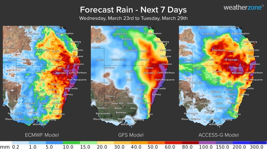 The maps above show that while there is still some model disagreement about rainfall amounts, most models agree that parts of eastern or northeast NSW will be a focus for heavy rain during the coming week.