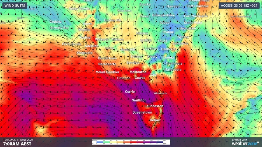 Accompanying the winds is a notable amount of rainfall. Tassie is expected to bear the brunt, with accumulations ranging from 40 to 80 mm in the west and north, and 15-30 mm in other areas of the state by Wednesday morning. Meanwhile, about 40-60 mm of rain may fall over eastern VIC and southeast NSW, particularly impacting the ranges and alpine areas (Figure 2).