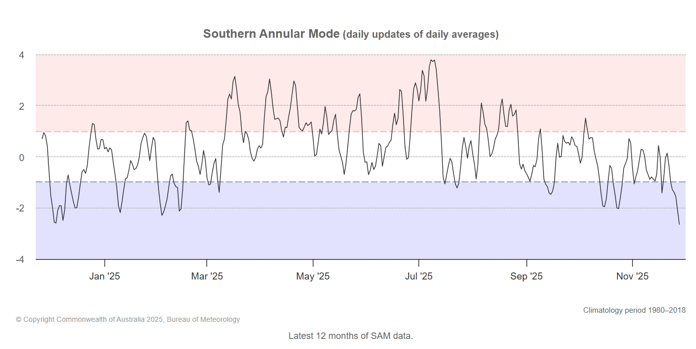 Image: Phases of the Southern Annular Mode over the past 12 months to November 28, 2025. Source: BoM.