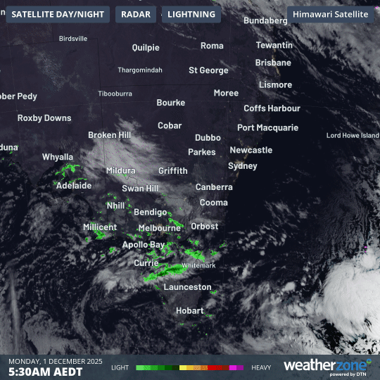 Image: Combined satellite and radar loop across Tasmania and SE Australia on the morning of Monday, December 1, 2025.