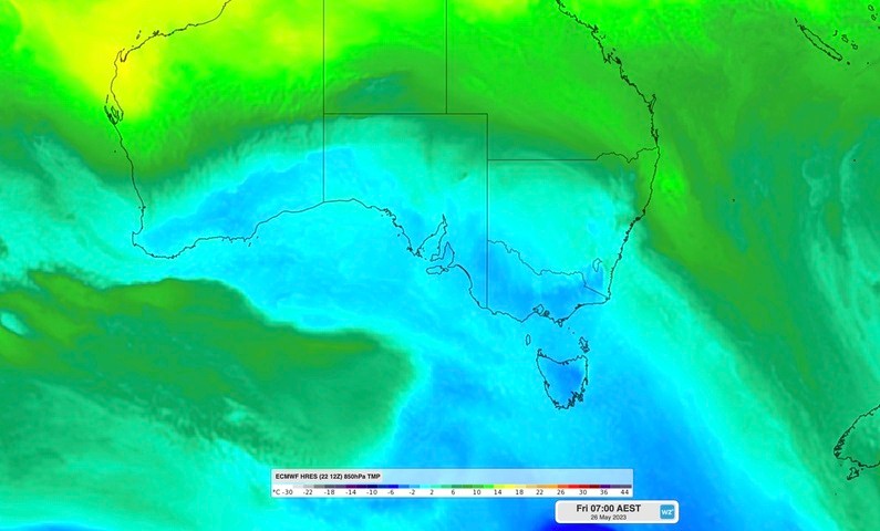 The satellite image below shows a large pool of cold air located to the southwest of Australia on Tuesday. This frigid air mass will cross the Bight on Wednesday before barrelling across southeastern Australia on Thursday and Friday.