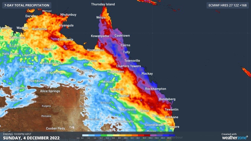 Images: Forecast weekly rainfall according to two different computer models. Top image: ECMWF model’s forecast accumulated precipitation during the 7 days ending at 11pm AEST on Sunday, December 4. Bottom image: GFS model’s forecast accumulated precipitation during the 7 days ending at 4am AEST on Monday, December 5.