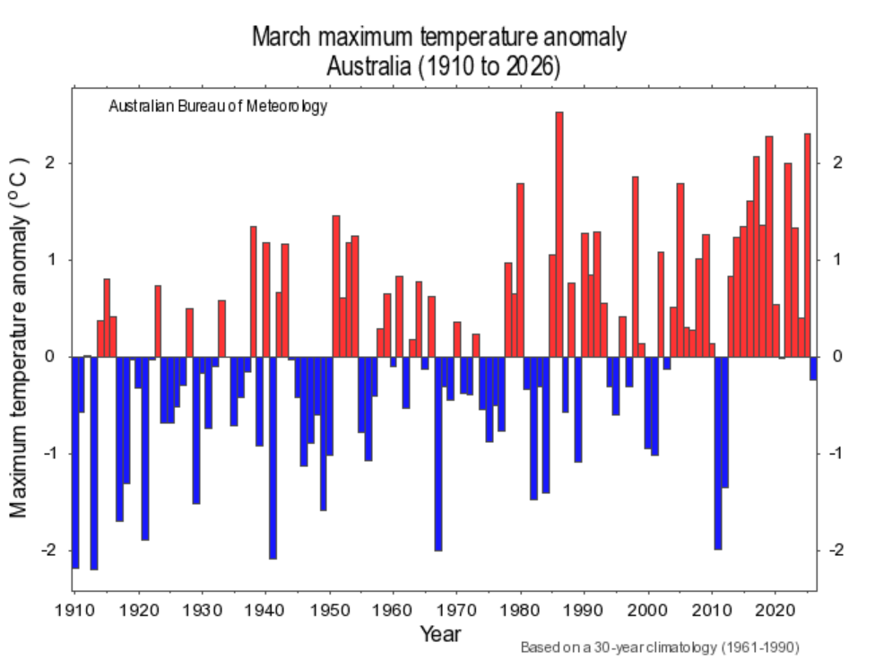 Image: Historical March maximum temperature anomalies in Australia since 1910. Source: BoM.