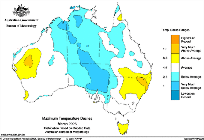 Image: Maximum temperature deciles in Australia in March 2026. Source: BoM.