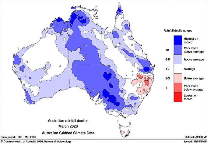 Image: Australian rainfall deciles in March 2026. Source: BoM.