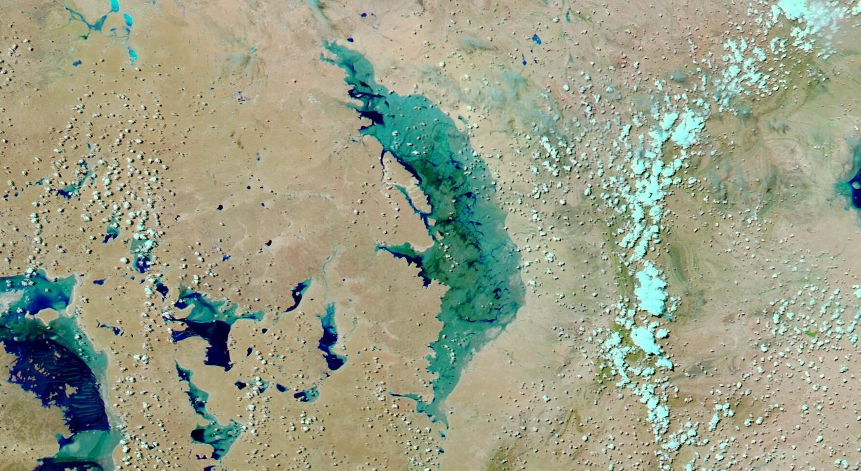 The two images below are false-colour satellite images of the state’s north, showing water in Lake Eyre and surrounding areas at the start of the month and near the end of the month.