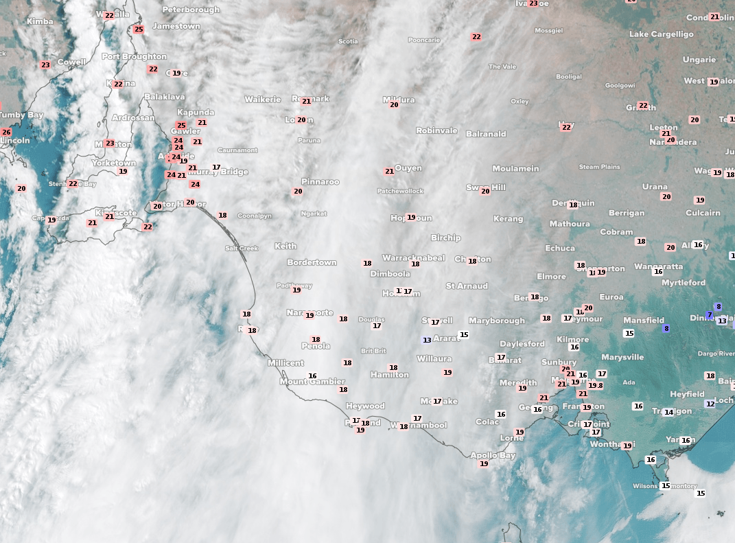 Image: Satellite (Himawari-8) imagery at 10am EST Saturday with observed temperature overlay